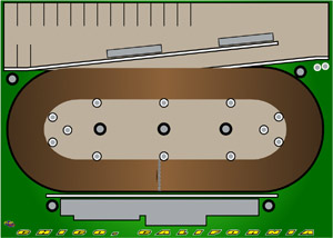 Dirt Oval, 16 Pit Stalls, Start/Finish Line, 2 Wide Racing, Chico, Pits along the back stretch, California Text Along The Bottom